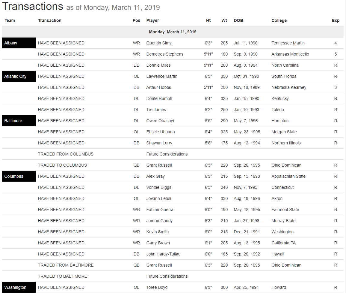 AFL, Albany Empire, Atlantic City, Baltimore Brigade, Columbus Destroyers, Transactions, Washington Valor March 11, 2019 – League Transactions Posted by FanZoneNetwork on March 12, 2019 Share this: Click to share on X (Opens in new window) X Click to share on Facebook (Opens in new window) Facebook More Click to share on LinkedIn (Opens in new window) LinkedIn Click to share on Reddit (Opens in new window) Reddit Click to share on X (Opens in new window) X Like Loading... Related