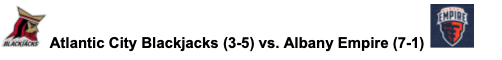 Player to Watch: WR Malachi Jones, Albany Empire. Jones dominated the Blackjacks last time the two teams played in Atlantic City. Jones caught 12 passes for 106 yards and three touchdowns.