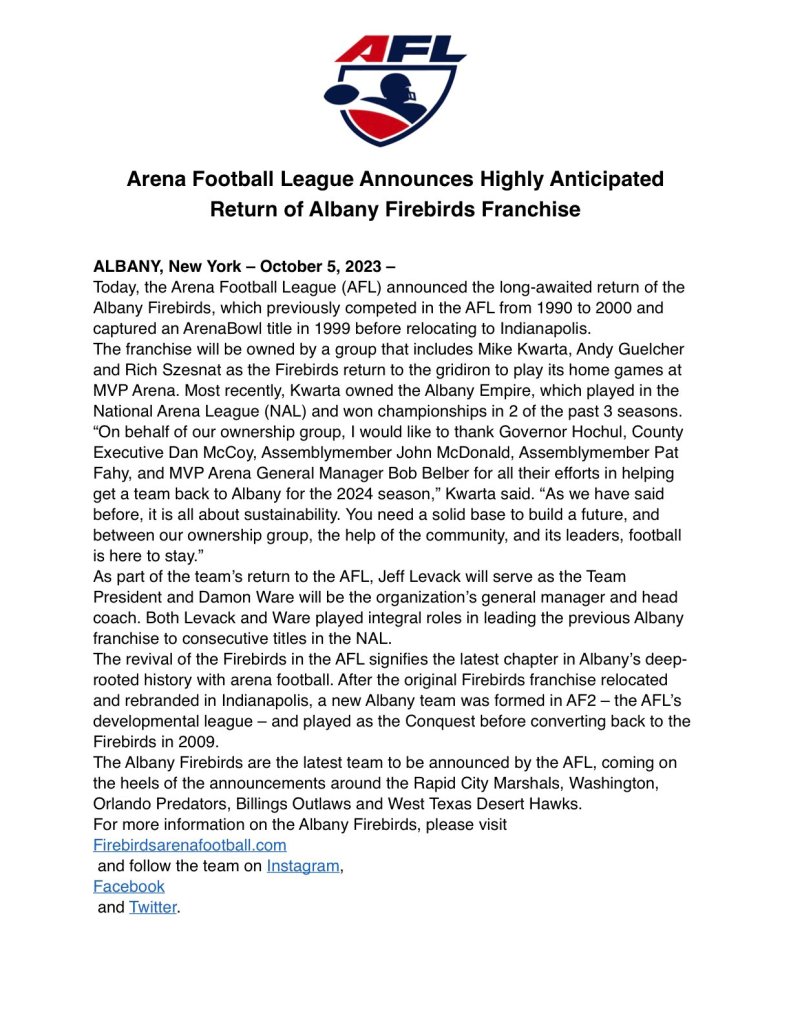 Albany Empire Albany Firebirds Make Their Return to the AFL Posted by FanZoneNetwork on October 16, 2023October 16, 2023 Share this: Click to share on X (Opens in new window) X Click to share on Facebook (Opens in new window) Facebook More Click to share on LinkedIn (Opens in new window) LinkedIn Click to share on Reddit (Opens in new window) Reddit Click to share on X (Opens in new window) X Like Loading... Related