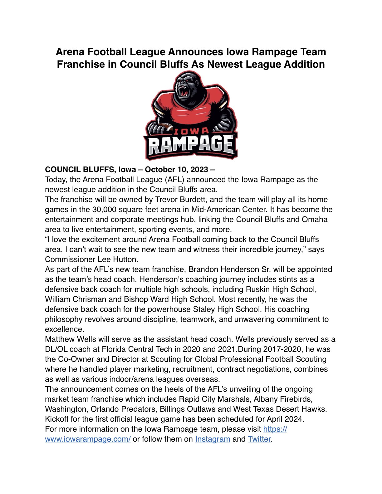 Iowa Rampage Iowa Rampage Announced as the Newest AFL Team Posted by FanZoneNetwork on October 17, 2023October 16, 2023 Share this: Click to share on X (Opens in new window) X Click to share on Facebook (Opens in new window) Facebook More Click to share on LinkedIn (Opens in new window) LinkedIn Click to share on Reddit (Opens in new window) Reddit Click to share on X (Opens in new window) X Like Loading... Related