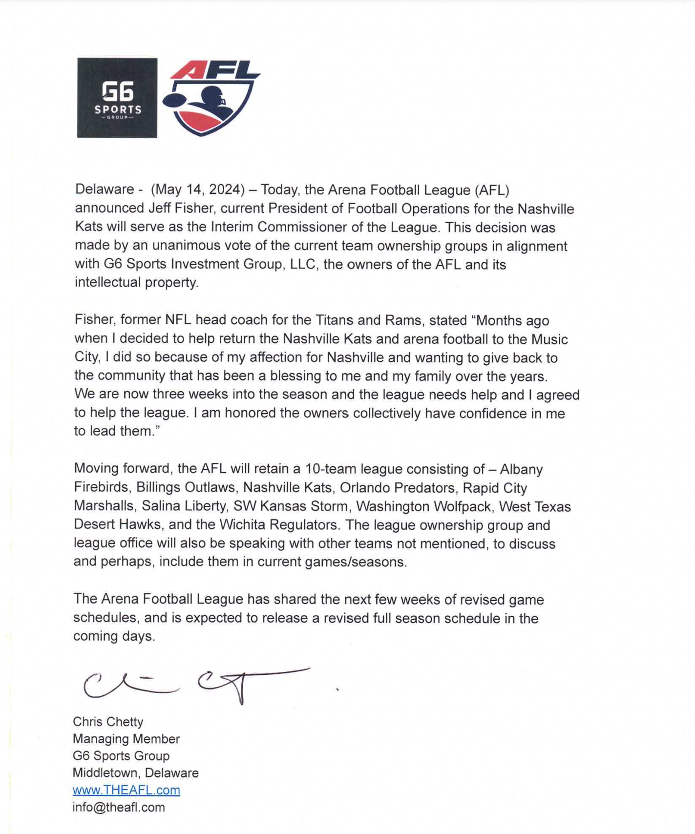 AFL, Press Release Jeff Fisher Named Interim Commissioner of Realigned AFL Posted by FanZoneNetwork on May 15, 2024 May 14, 2024 – Today, the Arena Football League (AFL) announce Jeff Fisher, current President of Football Operations for the Nashville Kats will serve as the Interim Commissioner of the League. Share this: Click to share on X (Opens in new window) X Click to share on Facebook (Opens in new window) Facebook More Click to share on LinkedIn (Opens in new window) LinkedIn Click to share on Reddit (Opens in new window) Reddit Click to share on X (Opens in new window) X Like Loading... Related