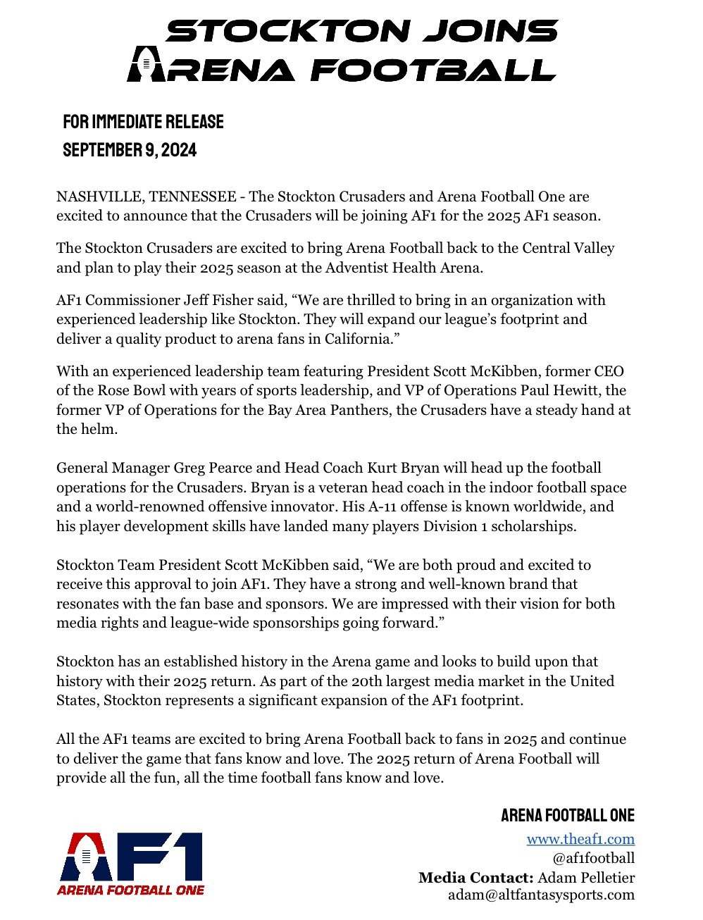 FOR IMMEDIATE RELEASE SEPTEMBER 9, 2024 NASHVILLE, TENNESSEE – The Stockton Crusaders and Arena Football One are excited to announce that the Crusaders will be joining AF1 for the 2025 AF1 season.