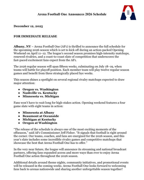 “The release of the schedule is always one of the most exciting moments of the offseason,” said AF1 Commissioner Jeff Fisher. “It signals that football is right around the corner. Our teams, coaches, and fans are energized for the 2026 season, and this year’s slate includes some incredible rivalry games and competitive matchups that showcase the best that Arena Football One has to offer.”